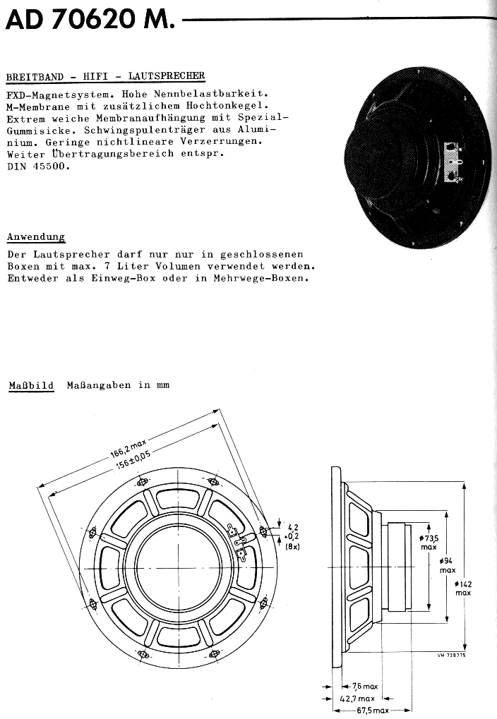 Bei mir wird es ein geschlossenes Gehäuse, nur wie groß? Ist es zu groß, so fängt der Bass an zu dröhnen, ist es zu klein, fehlt der Bass stattdessen. Ausgangsbasis war nur die Aufschrift auf dem Lautsprecher, auf einem Steht AD 70620/m4. Eine Internetrecherche ergab, dass er von Valvo stammt, was einst eine Phillips-Tochter war und dass er ein geschlossenes Gehäuse von maximal 7 Liter mag. Quelle Leider ist die Quelle nur eine Bilddatei, welche sich mit einer Texterkennung jedoch lesen lässt. Der zweite Lautsprecher hat die Aufschrift 4 Ohm 680-07340. Zu ihm fand ich leider nichts. Ich behandele ihn einfach genauso wie den Valvo, in der Hoffnung, dass es ihm gefällt. Die Verwendung unterschiedlicher Lautsprecher ist allerdings nicht optimal. Ich hoffe, dass es wenig auffällt und dass man falls doch das Gehäuse für zwei andere zusammenpassende weiterverwenden kann. Wenn einer weiß, was es mit dem zweiten auf sich hat, oder mir einen zweiten von einem der beiden Exemplare überlassen kann, so kann er sich gerne melden.